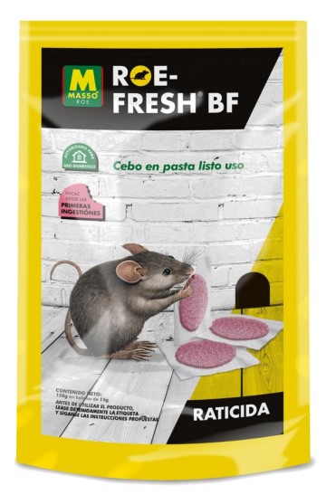 Raticida Roe fresh 150gr. 231707. Cebo en pasta rosa. Bolsitas monodosis de 15 gr. Listo para su uso como rodenticida anticoagulante. Eficaz para el control de rata gris y ratón común. Activo con una sola ingestión. Monodosis enriquecidas con cereales listo uso con portacebos. Efectivo en roedores jóvenes y adultos. Composición: Brodifacoum 0.0025 %.
