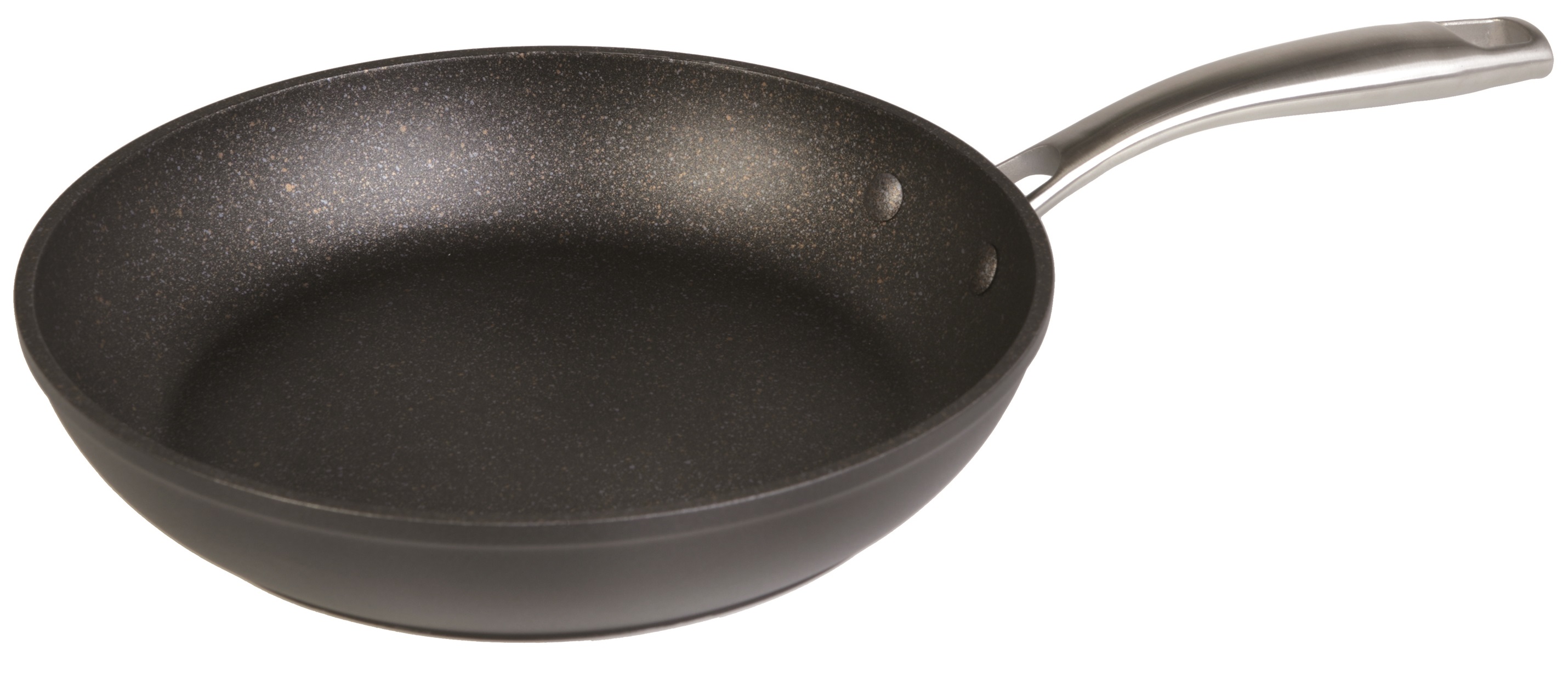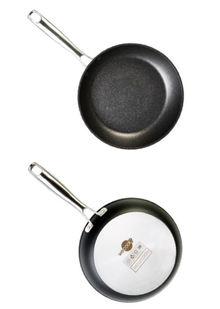 Sartenes de aluminio forjado. Espesor 4mm Antiadherente QuanTanium, 5 capas, formado por una mezcla única de partículas de Titanium esparcidas por las capas del antiadherente que le proporcionan una mayor resistencia y durabilidad que los antiadherentes convencionales. Apta para todo tipo de cocinas incluida la inducción. Base de inducción COMPLETA. Mango en acero inoxidable mate, remachado.
