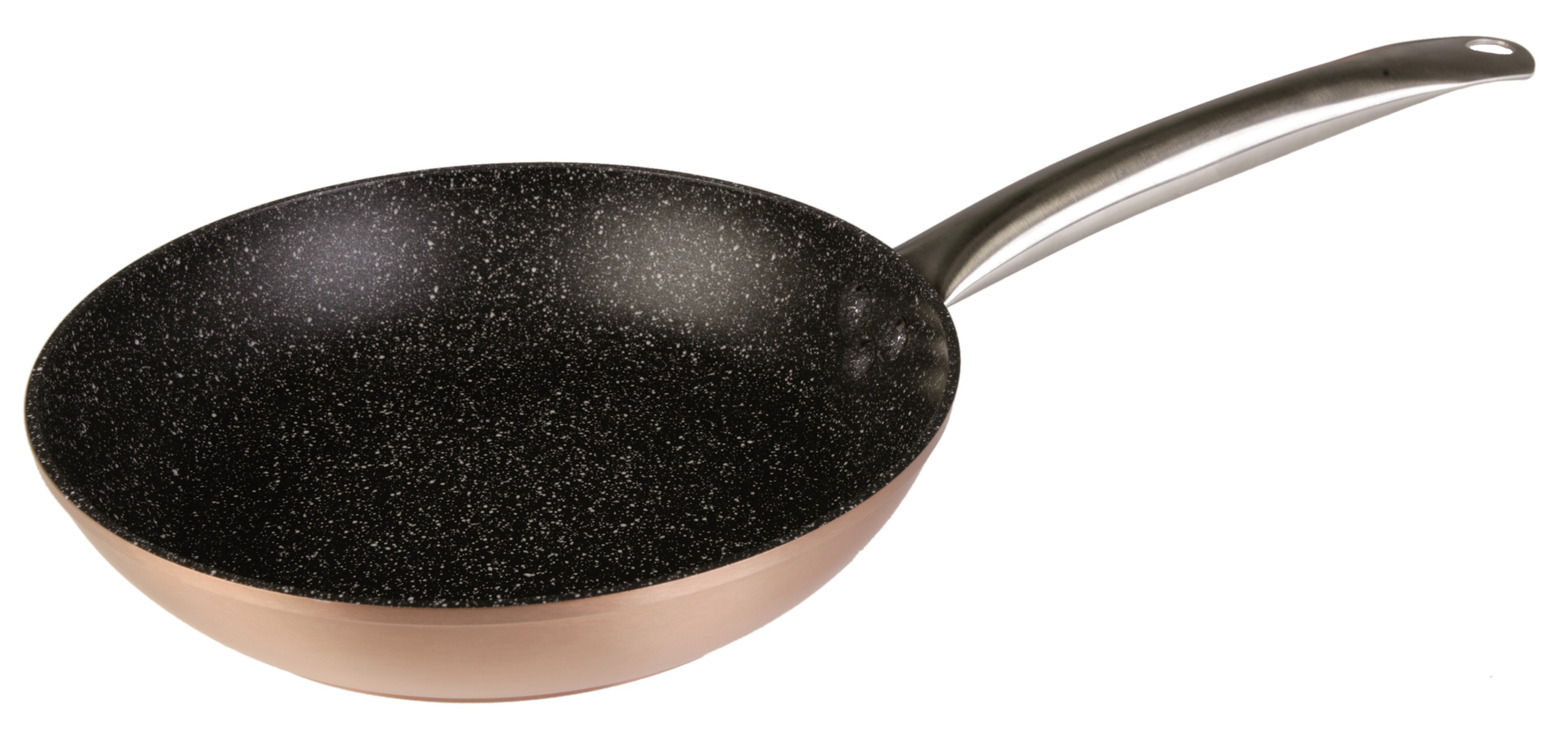 Sartenes de aluminio forjado Espesor 2.8mm Antiadherente interior 2 capas libre en PFOA, ecológico. Apta para todo tipo de fuegos, inducción y horno. Base de inducción lisa COMPLETA. Recubrimiento exterior de silicona color cobre para una máxima resistencia al calor y las abrasiones. Mango de acero remachado en tres puntos para una máxima seguridad.