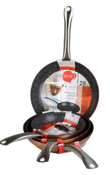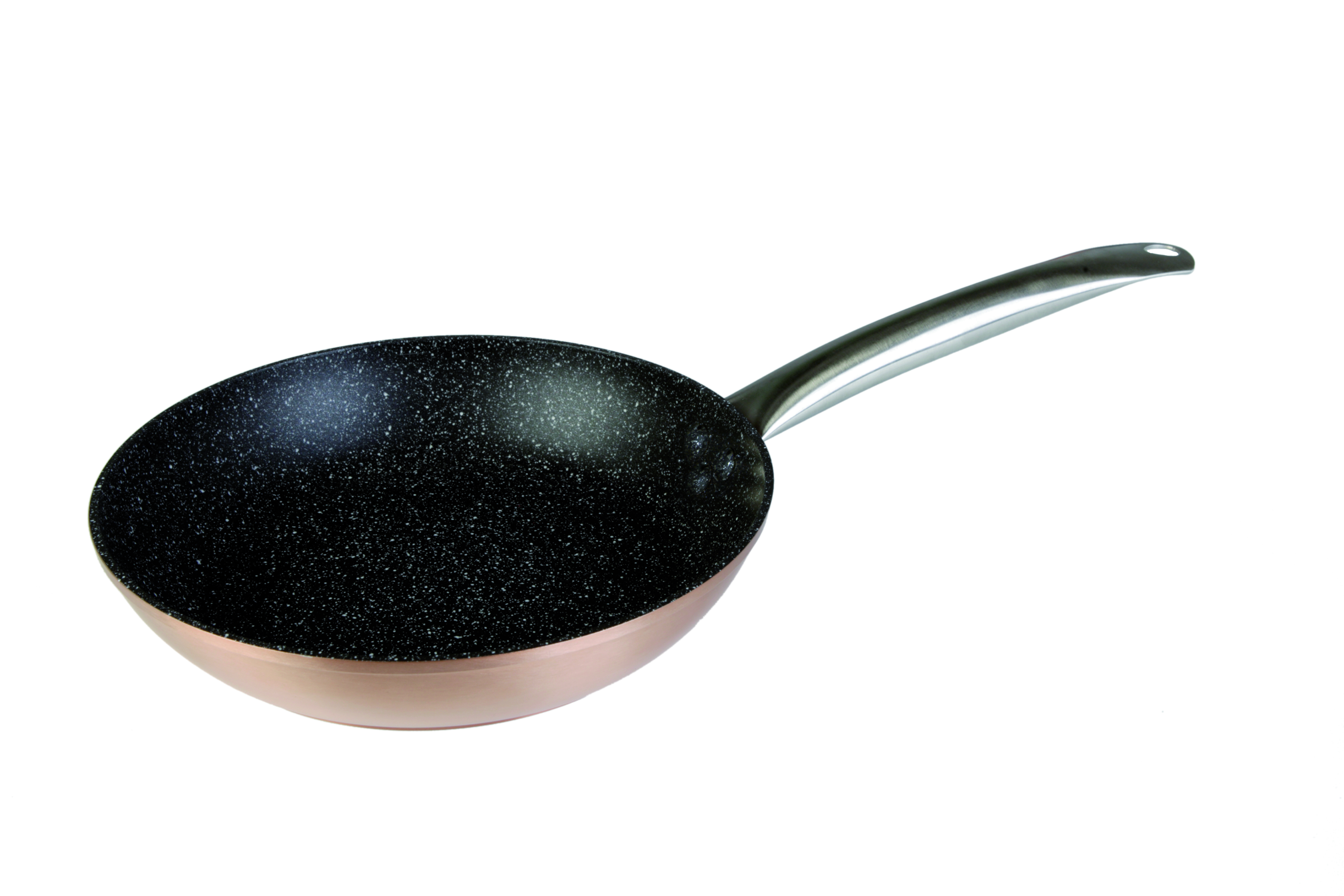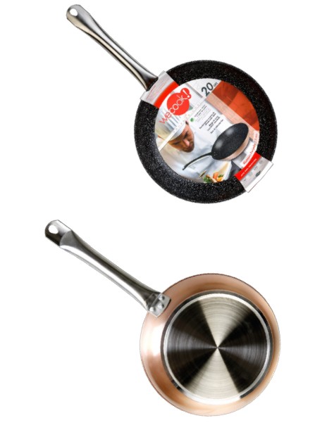 Sartenes de aluminio forjado Espesor 2.8mm Antiadherente interior 2 capas libre en PFOA, ecológico. Apta para todo tipo de fuegos, inducción y horno. Base de inducción lisa COMPLETA. Recubrimiento exterior de silicona color cobre para una máxima resistencia al calor y las abrasiones. Mango de acero remachado en tres puntos para una máxima seguridad.