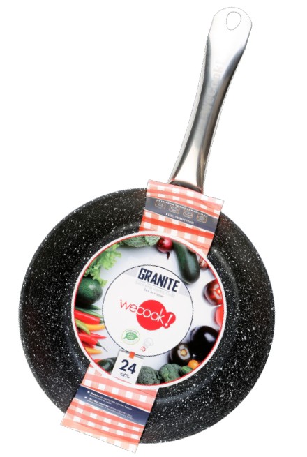 Espesor 3 mm. Antiadherente tipo piedra interior y exterior, libre en PFOA, ecológico. Apta para todo tipo de fuegos, inducción y horno. Base de induccio´n COMPLETA “Full Induction”. Mango de acero remachado en tres puntos para una máxima seguridad.