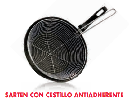 SARTEN CON CESTILLO ANTIADHERENTE. Remaches de acero inoxidable.