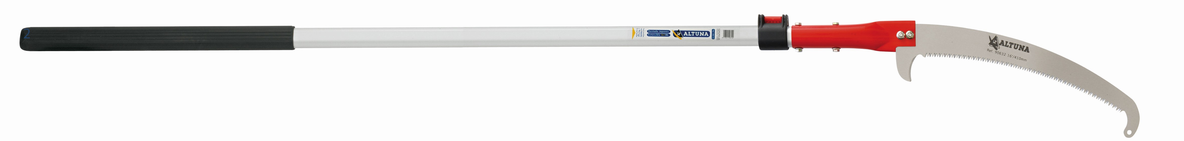 Altuna pértiga y serrucho 90632. Pértiga ovalada telescópica, hoja de dentado japonés, dientes endurecidos, con doble gancho. Pértiga de 1.5+1.5. Altura máxima de trabajo 6.5 mt. Mango tubo de aluminio reforzado y tratado , revestido de goma antideslizante. Doble sistema de bloqueo integrado en la empuñadura.