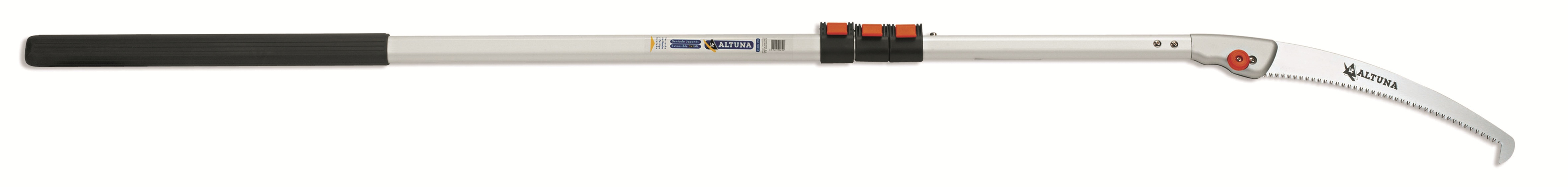 Altuna pértiga y serrucho 90611. Pértiga ovalada telescópica, sistema plegable y hoja de dentado japonés, dientes endurecidos, con gancho superior. Pértiga de 1.5+1.5+1.5. Altura máxima de trabajo 6.5 mt. Hoja plegable.Mango tubo de aluminio reforzado y tratado , revestido de goma antideslizante. Doble sistema de bloqueo integrado en la empuñadura.