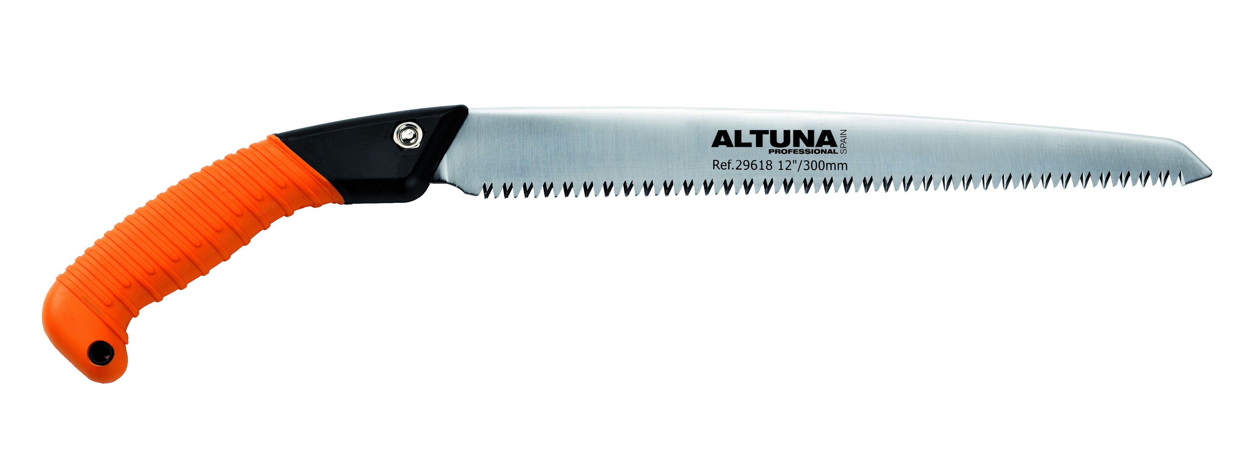 Serrucho de hoja recta dentado japonés sin funda. Mango de aluminio engomado. Medida 330 mm.