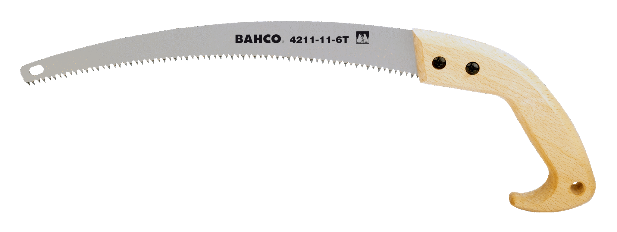 Serrucho de poda manual con dientes templados y mango de madera 6 DPP 11" .4211-11-6T. 280MM. Para madera seca o dura. Hoja curvada con dentado duro y totalmente rectificado. Con dentado duro (4211) y con dentado afilable (4212). Hoja curvada resistente con 6 dientes por pulgada. Disponibles con hojas de 11" y 14" de longitud.Mango de madera de haya cómodo y resistente, con un largo gancho.Hojas de repuesto disponibles.