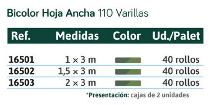 | 49822 | VALFE SETO ARTIFICIAL BICOLOR HOJA ANCHA 110 VARILLAS 1,0X3M | |||||