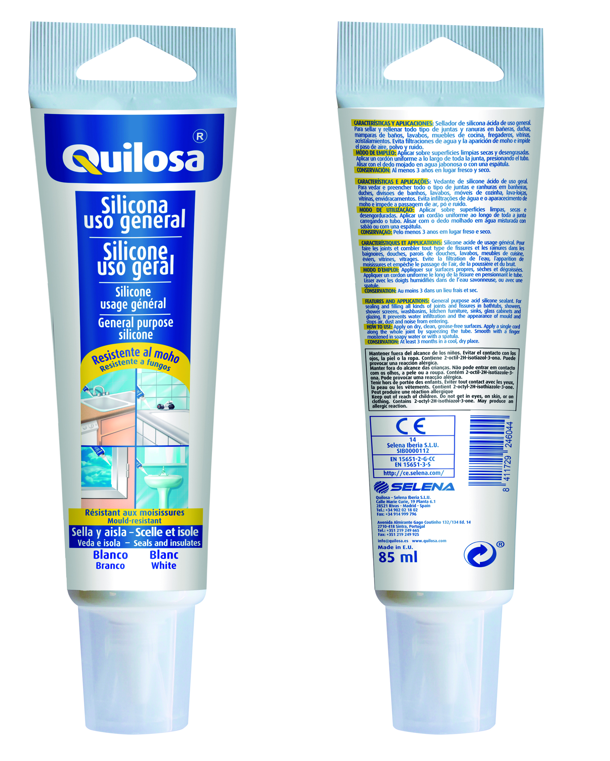 Sellador de silicona ácida con fungicida que evita la aparición de moho. Para sellar y rellenar todo tipo de juntas y ranuras en baños y cocinas, vitrinas y acristalamiento. Envase tubo fácil aplicación sin necesidad de pistola.