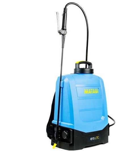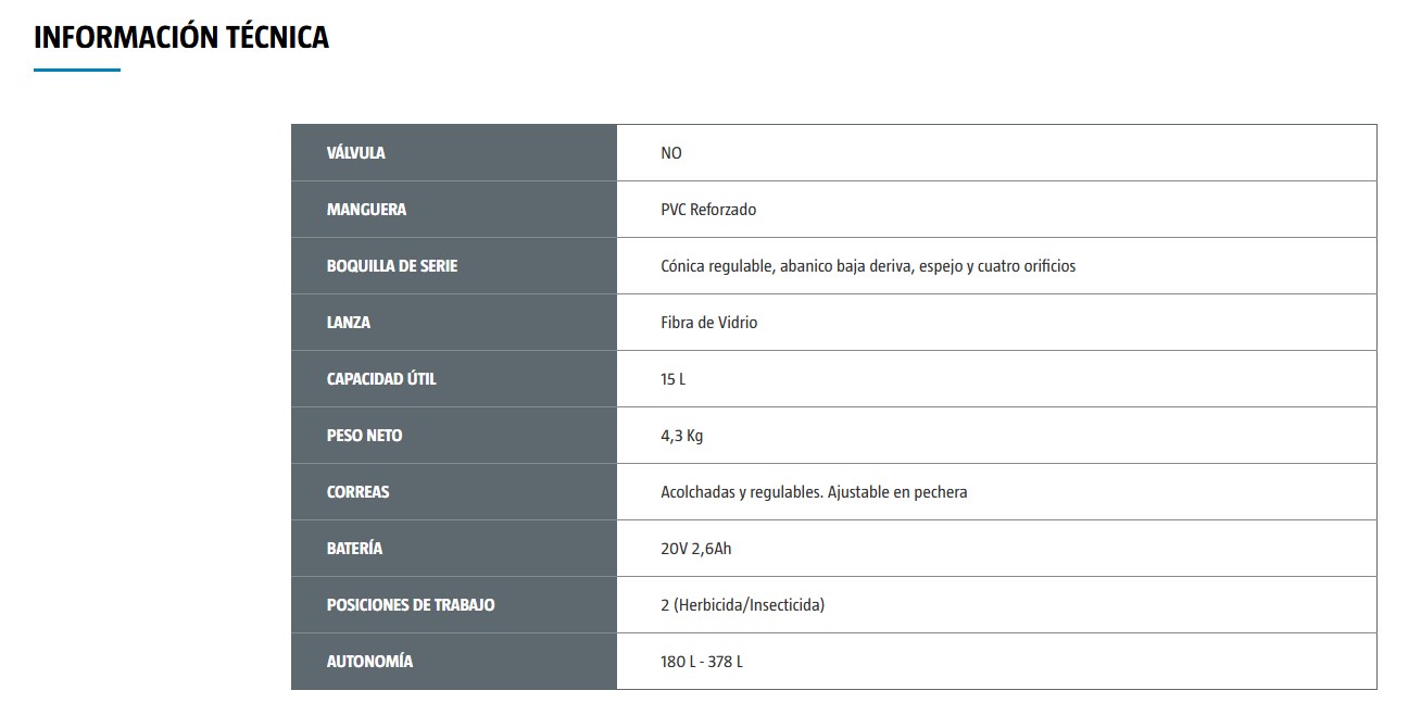 Pulverizador eléctrico profesional e15 LTC Pulverizador eléctrico e15 LTC, profesional, ligero y robusto. Diseñado para la aplicación de los tratamientos en agricultura, huerta y jardinería profesional. Su control electrónico LTC y capacidad de 15 litros, lo hacen ideal para un uso prolongado, eficiente y sin esfuerzo. Ventajas Control electrónico para una pulverización homogénea Dos modos de trabajo. HIGH Mode: Insecticida + Fungicida / LOW Mode: Herbicida Batería Li-ion fácilmente extraíble Amplia autonomía hasta 25 depósitos de pulverización (180L-375L) Kit de 4 boquillas incluido Repuestos garantizados Para aplicaciones agrícolas. Información técnica Válvula NO Manguera PVC Reforzado Boquilla de serie Cónica regulable, abanico baja deriva, espejo y cuatro orificios Lanza Fibra de Vidrio Capacidad Útil 15 L Peso neto 4,3 Kg Correas Acolchadas y regulables. Ajustable en pechera Batería 20V 2,6Ah Posiciones de trabajo 2 (Herbicida/Insecticida) Autonomía 180 L - 378 L