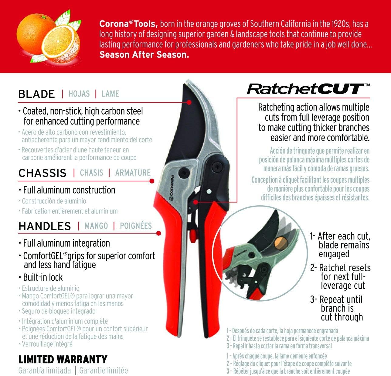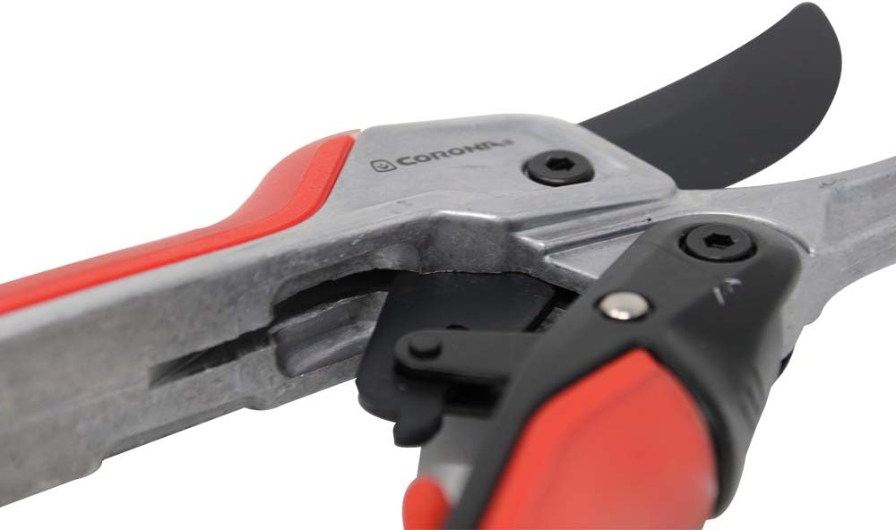 Tijera de una mano con sistema de palanca que multiplica la fuerza de corte por 4, hojas con recubrimiento antiadherente.Capacidad de corte 20mm. Total confort y facilidad de corte de ramas gruesas y duras. Mangos de ComfortGEL® ergonómicos para una adaptación total a la mano. Multiplicador de potencia: el mecanismo ratchetcut multiplica la potencia de corte por 4 con cada clic; reduce el esfuerzo durante el corte de rramas gruesas y permite realizar un corte progresivo.Tijera de aluminio de una sola pieza para mayor durabilidad. La hoja son de acero al carbono con revestimiento antiadherente para mejorar el rendimiento de corte.