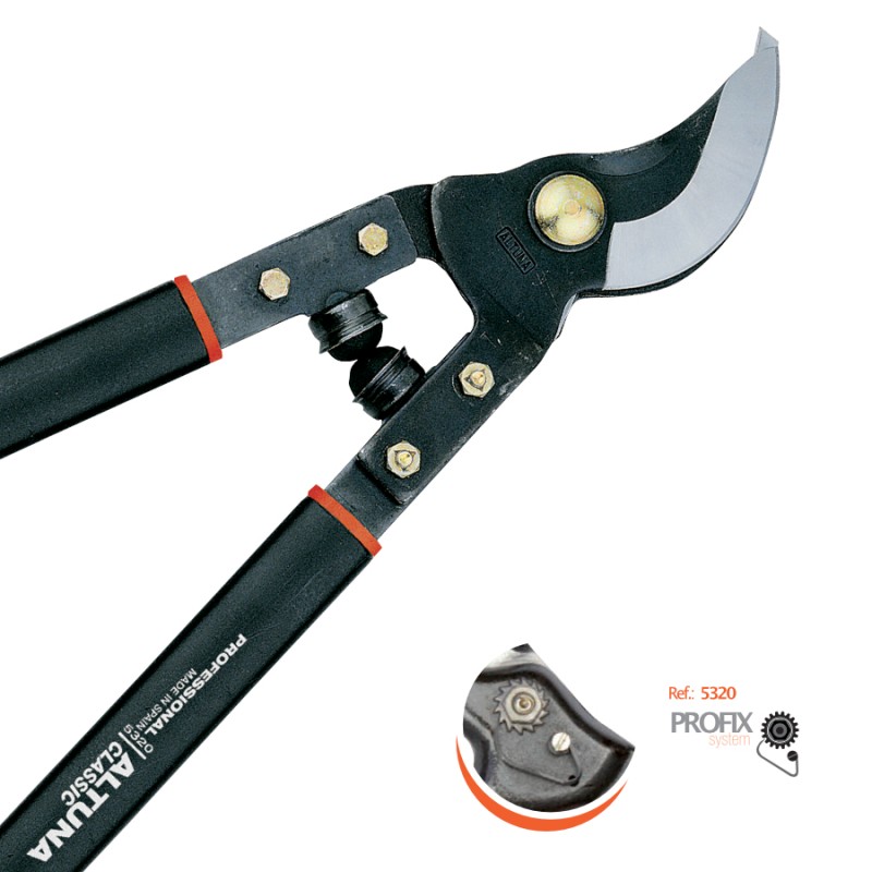 Tijera poda Dos manos Altuna 5320 .Tijera de podar dos manos Classic Profesional. Con corte de precisión Cabeza de corte forjada y lengüeta de ajuste Profix. Sistema de corte Bypass, para uso en poda verde, árboles, olivos, frutales, viñedos. Medida Largo 42 cm . Diámetro máximo de la rama 35 mm.