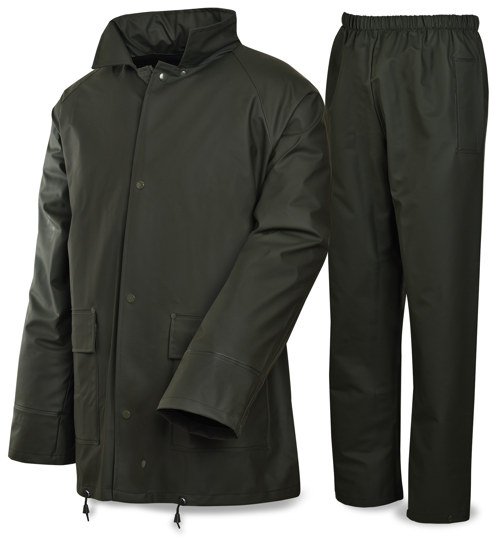188TAPPV Traje de agua PU/PVC/PES verde 300 g. Traje de agua de SEMI PU (PU+PVC+PES) compuesto por chaqueta con capucha escamoteable y pantalón, de Poliuretano con costuras termoselladas. Composición: Lámina exterior: 100% Poliuretano. Lámina intermedia: 100% PVC. Lámina interior: 100% Poliéster Tallas S/M/L/XL/XXL