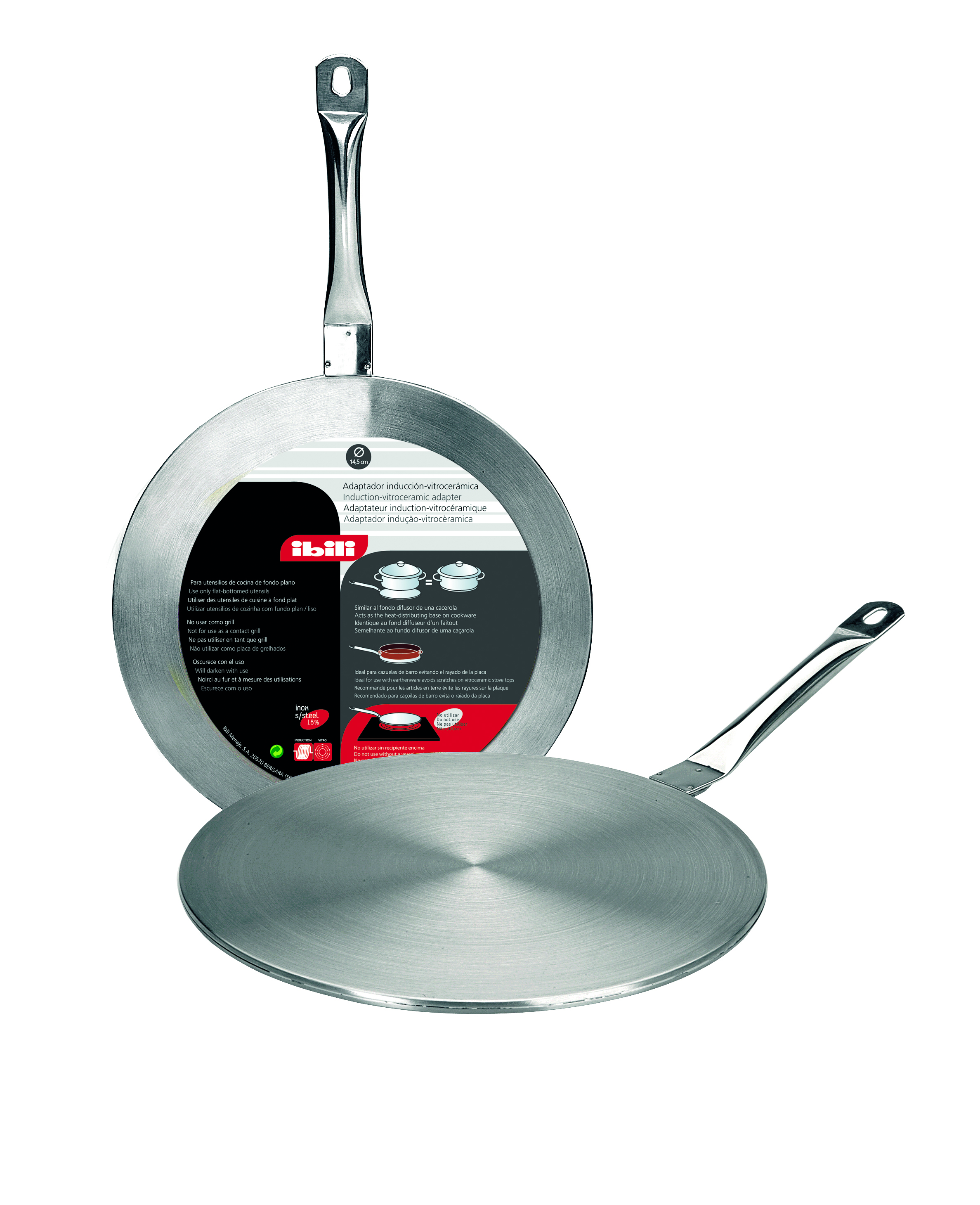 Adaptador para inducción-vitroceramica en acero inox 18/10. Apto para todo tipo de cocinas. Válido para lavavajillas. Permite la utilización de cace- rolas, ollas... No validas en cocinas de inducción y vitrocerámicas.
