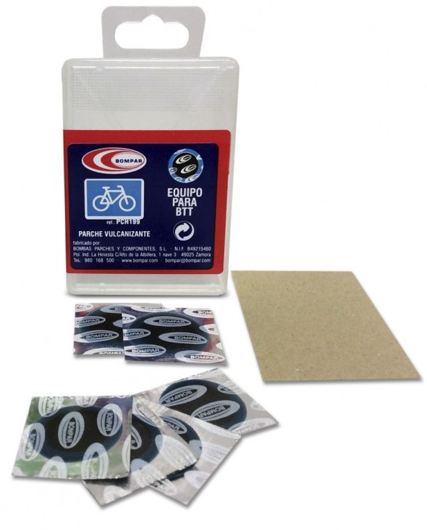 Caja de parches para BICI BTT y cliclomotores compuesta de: 6 parches de diferentes tamaños, 1 tubo de disolución 8 ml y 1 lija.